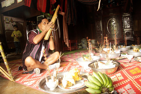 | Già Quỳnh Nghìn (bác của già làng Hạnh), đang thổi khèn sau nghi thức lễ tri ân các Giàng. |